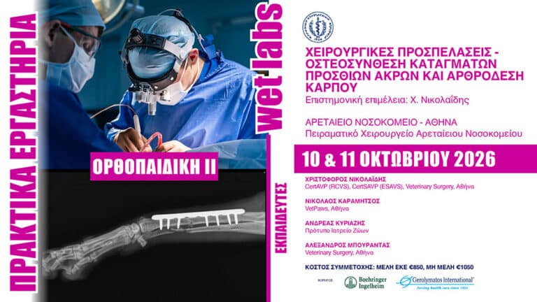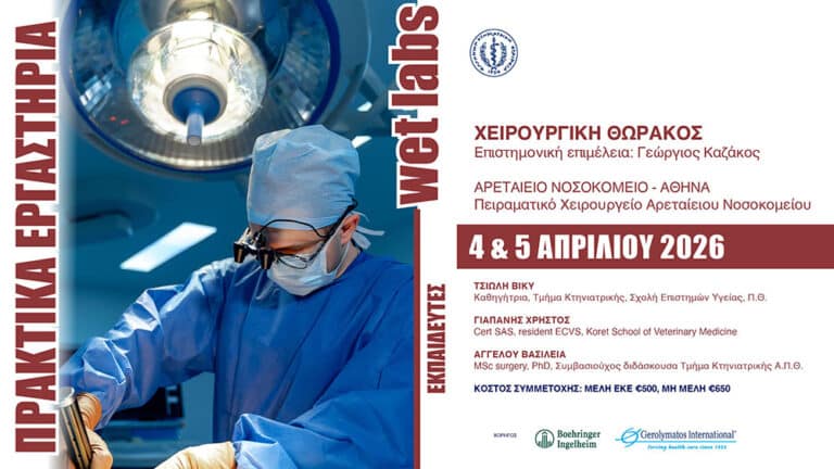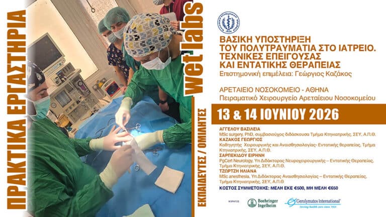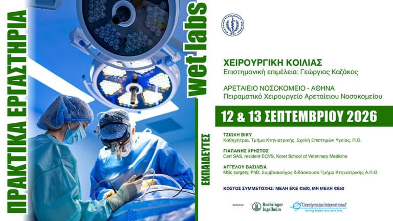 Η Ελληνική Κτηνιατρική Εταιρεία / Κλάδος Ζώων Συντροφιάς διοργανώνει το Σάββατο 13 και την Κυριακή 14 Ιουνίου 2026 ημερίδα Επείγουσας και Εντατικής Θεραπείας (με πρακτική άσκηση) στις εγκαταστάσεις του Ερευνητικού Πειραματικού Χειρουργείου του Αρεταιείου Νοσοκομείου στην Αθήνα με Θέμα: «Βασική Υποστήριξη του Πολυτραυματία στο Ιατρείο. Τεχνικές επείγουσας και εντατικής Θεραπείας».