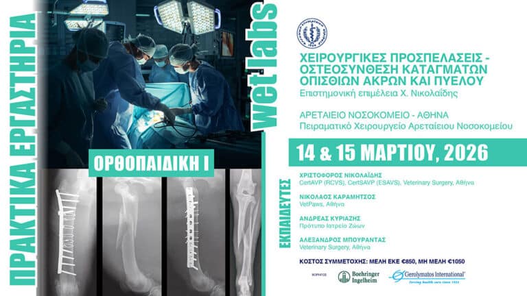 ΕΚΠΑΙΔΕΥΤΕΣ: ΤΣΙΩΛΗ ΒΙΚΥ, Καθηγήτρια, Τμήμα Κτηνιατρικής, Σχολή Επιστημών Υγείας, Π.Θ. ΓΙΑΠΑΝΗΣ ΧΡΗΣΤΟΣ, Cert SAS, resident ECVS, Koret School of Veterinary Medicine ΑΓΓΕΛΟΥ ΒΑΣΙΛΕΙΑ, MSc surgery, PhD, Συμβασιούχος διδάσκουσα Τμήμα Κτηνιατρικής Α.Π.Θ. ΠΡΟΓΡΑΜΜΑ Σάββατο 4 Απριλίου 2026 17.30 -18.00 Προσέλευση – Καφές 18.00 – 20.00 Θεωρητικό μέρος – Παρουσίαση των τεχνικών