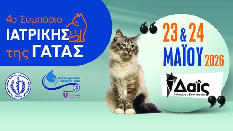 Mε ιδιαίτερη χαρά σας προσκαλούμε να συμμετάσχετε στο 4ο Συμπόσιο Ιατρικής της Γάτας της Ελληνικής Κτηνιατρικής Εταιρείας, το Σαββατοκύριακο 23 & 24 Μαΐου 2026, στον Πολυχώρο εκδηλώσεων Δαΐς. Η ιατρική και η υγεία της γάτας αποτελεί τα τελευταία χρόνια το επίκεντρο της ιατρικής των ζώων συντροφιάς και εξελίσσεται ραγδαία. Συντονισμένη