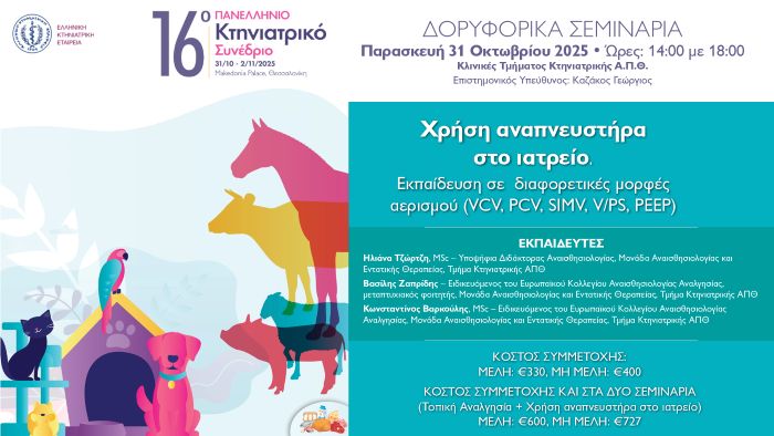 Χρήση αναπνευστήρα στο ιατρείο Εκπαίδευση σε διαφορετικές μορφές αερισμού (VCV, PCV, SIMV, V/PS, PEEP) Παρασκευή 31 Οκτωβρίου 2025, ώρες: 14:00 με 18:00 Επιστημονικός Υπεύθυνος: Καζάκος Γεώργιος Σκοπός Σεμιναρίου: Η χρήση αναπνευστήρα είναι συχνά απαραίτητη κατά τη διάρκεια της αναισθησίας των ζώων συντροφιάς, καθώς και σε καταστάσεις εντατικής θεραπείας. Η όλο κι