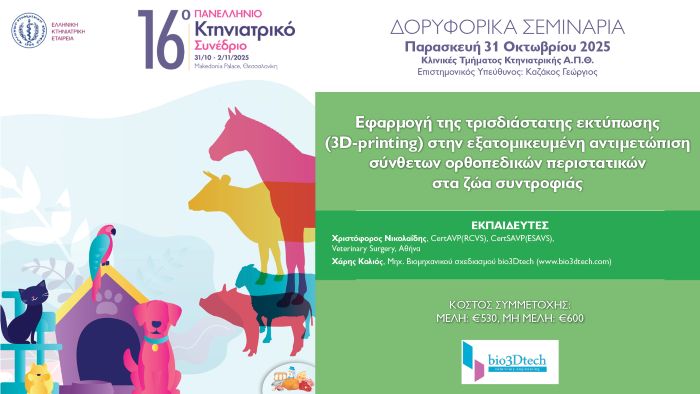 Εφαρμογή της τρισδιάστατης εκτύπωσης (3D-printing) στην εξατομικευμένη αντιμετώπιση σύνθετων ορθοπεδικών περιστατικών στα ζώα συντροφιάς – Παρασκευή 31 Οκτωβρίου, Κλινικές Τμήματος Κτηνιατρικής Α.Π.Θ.