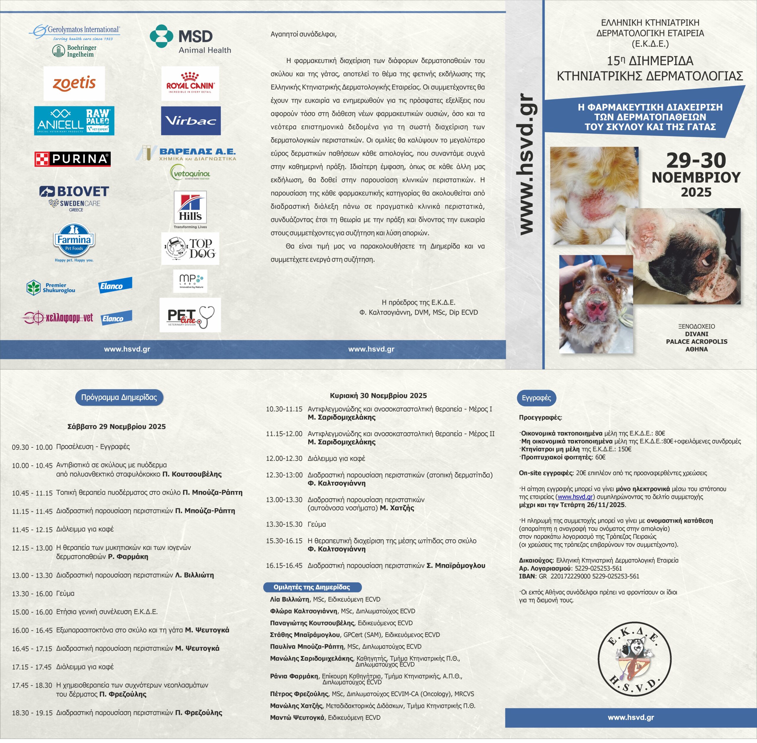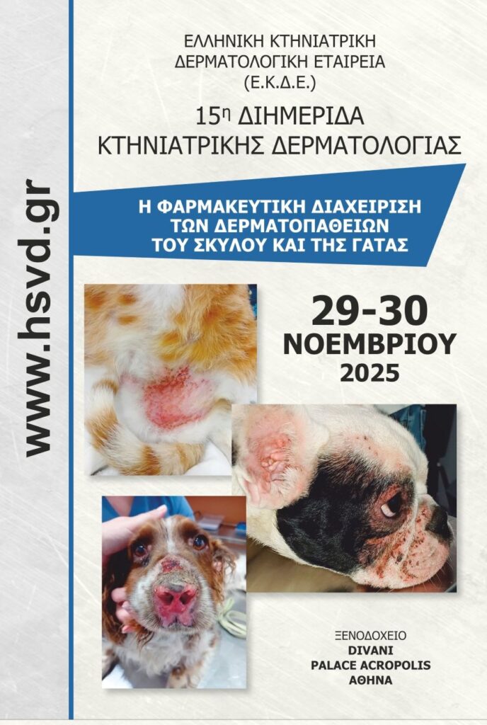 Η 15η Διημερίδα της Ε.Κ.Δ.Ε. με θέμα τη «Η φαρμακευτική διαχείριση των δερματοπαθειών του σκύλου και της γάτας» θα πραγματοποιηθεί στην Αθήνα, στις 29-30 Νοεμβρίου 2025 στο ξενοδοχείο Divani Acropolis (Παρθενώνος 19).